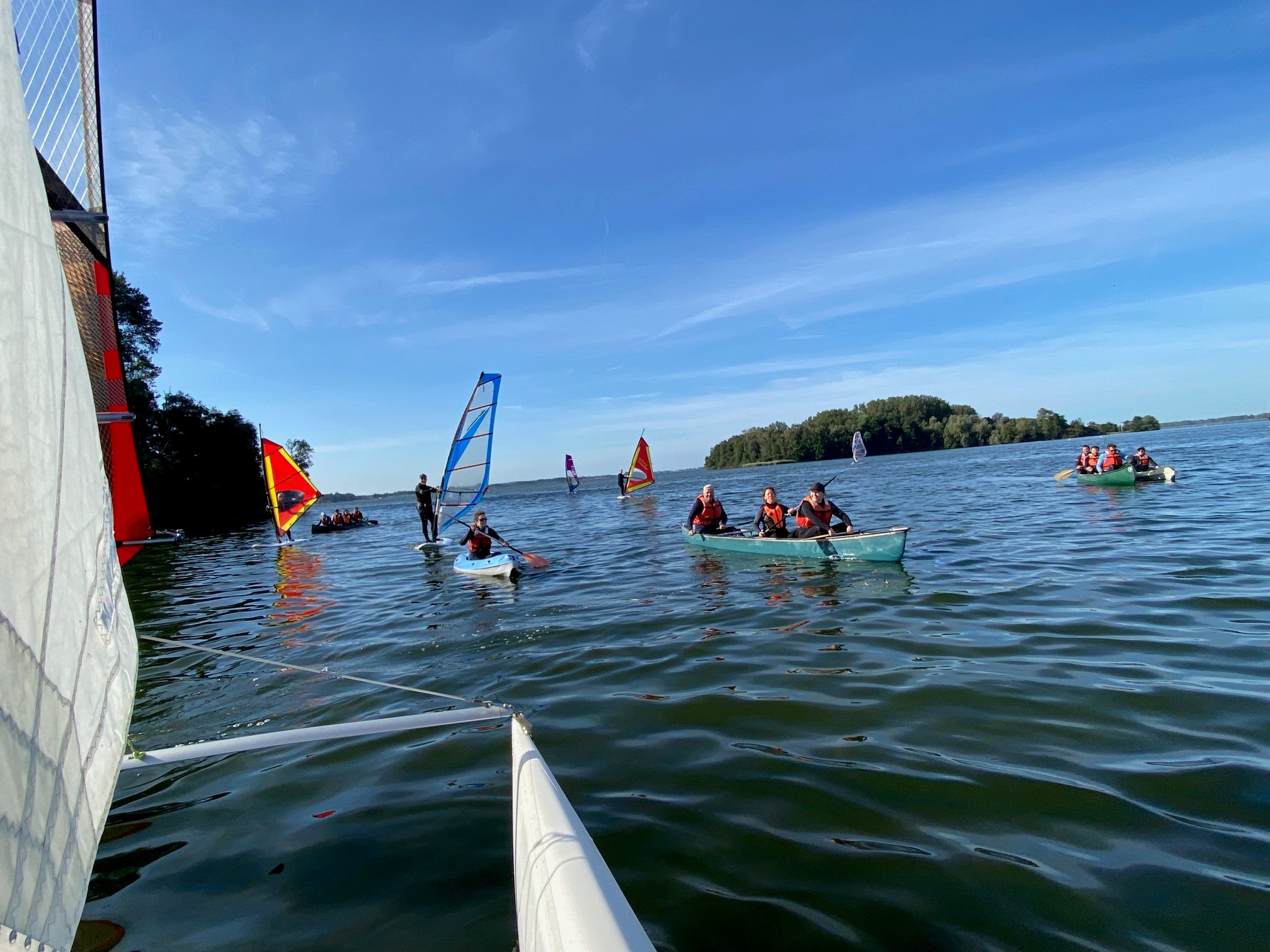 Im knie- bis hüfttiefen Wasser könnt ihr Wassersportarten schnell und sicher erlernen. Besonders für Anfänger und Fortgeschrittene im Windsurfen, Katamaransegeln und Opti-Segeln sind die Revierbedingungen ideal.